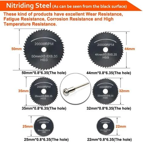 Qualité Premium —– Fabriqué en HSS (acier rapide) solide, durable et ferme , Le régime maximum du mini-jeu de lames de scie circulaire est de 20000, il est donc possible de réaliser ces fonctions (réglages avec précision, rapidité et précision de coupe ).