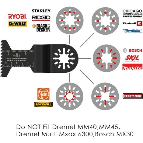 - 23 Pcs Accessoires d’outils Oscillants Multifonctions Lame de scie, utilisables pour la marque + le modèle suivant: (uniquement pour l’ancienne version): Fein Multimaster (ne convient pas pour Fein Multimaster QSL 350), Multi Talent FMM350Q FMT250 FMM250Q Ryobi RMT1801M, RMT200, RMT12011L Milwaukee M12, M18 Hitachi CV18DBL / W4 18V constructeur ERB474HTL, ERB620HTL, ERI616HTL, BT-MG 220 Einhell BT-TK 108li etc.