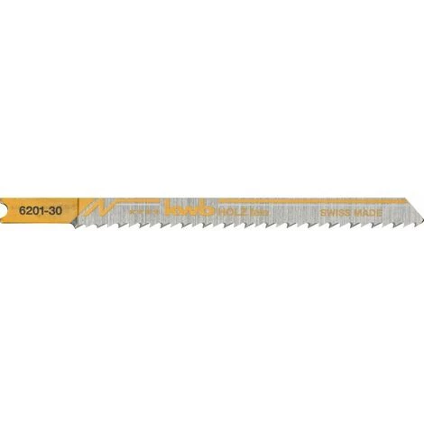 Lames de scies sauteuses, acier carbone HCS trempé, denture affûtée en croix et en dépouille, coupes rapides et propres, avec dent à entailler plongeant directement dans le matériau, pour bois, panneaux agglomérés, de menuisier et de fibres, matières plastiques souples.
