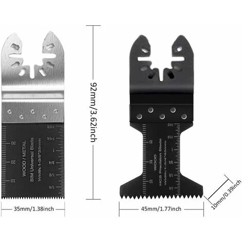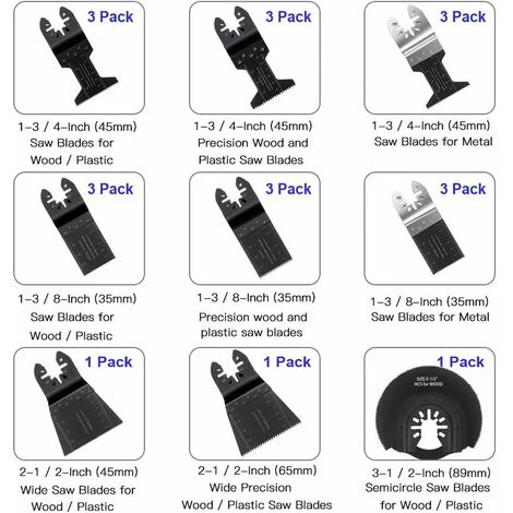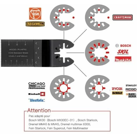 - [Applications Nombreuses] Kit 21 pcs lames de scie oscillante pour tous les travaux de coupe, idéal pour scier le bois, les panneaux de particules, le stratifié, le parquet, le plastique, le métal tendre (épaisseur ne dépassant pas 2 mm), etc. [Universel Facile] Kit 21 pcs lames de scie oscillante accessoires pour outils oscillants universels, facile à installer et démonte rapidement. [Solide Varié]Fabriquées en alliage et acier de haute qualité, plus épaisses et résistantes peuvent assurer une durée de vie plus longue. Et nombreux de forme, adaptés à diverses applications. [Adaptation]Exactement pour les applications professionnelles, pour Bosch Multi-X (sauf MX30), Dewalt, Portcable, Portable, Fein Multimaster (ancienne version), Fein Multi Master 250Q, Craftsman Nextec Multi Tool, Craftsman Nextec 17438, Craftsman Nextec 61199, Craftsman Nextec 5910, Craftsman 2702 2.0 Amp, Chicago 67256, Chicago 67537, Chicago 67538, Chicago 67707, Chicago 68303, Cougar, DeWalt, etc. et les appareils multifonctions les plus courants sur le marché. [Attention]Ne convient pas à Starlock, Bosch Starlock, Bosch MX30, Bosch MX30 EC-31, Bosch 350 CES, Bosch PMF 220 CE/PMF 250 CES/PMF 350 CES, Bosch Bleu, Bosch Multitool, Bosch Professional, Bosch OIS, Bosch et Dremel Quick Release Tools, Dremel MM40 / MM45, Dremel multimax 6300, Fein Supercut, Fein Starlock/Starlock Plus, Makit xmt03z 18V, WORX, Aldi, Aufnahme, Black and Decker.