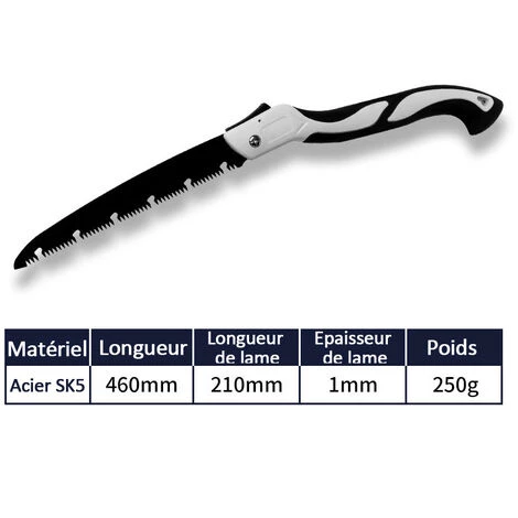 Materiau : lame en acier SK-5 de haute qualite et durable pour une coupe efficace lors de l’amenagement paysager de survie en camping et des travaux de jardinage generaux. De nombreuses scies a main sont fabriquees a partir de materiaux fragiles et bon marche qui se plient et meme se cassent apres quelques utilisations. Apres des semaines de tests, nous avons perfectionne la scie a main pliante.