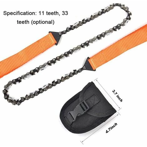 Cette scie à fil portative est incisive, de petite taille, légère et facile à transporter. Il peut couper du bois, des plastiques, des os, du caoutchouc, du métal mou et d’autres matériaux. C’est un bel outil pour la survie sauvage et la gestion des jardins. Fonctionnalités: Belle qualité, fermoir incisif, peut être du bois scié, du plastique, de l’os, du caoutchouc, du métal mou et d’autres matériaux. Petite taille, poids léger, facile à transporter, longue durée de vie, est un outil utile pour la survie dans la nature. Il est fait de ferromanganèse de haute qualité et de haute résistance, qui est un élément important dans l’équipement de camping et peut également être utilisé dans les jardins. Le modèle d’utilité a les caractéristiques d’une dentelure incisive et lisse et aucune blessure aux mains et aux vêtements. Il peut couper des branches, du bois, des plastiques, du caoutchouc, de l’os, du métal mou, etc. de différentes directions, ce qui est pratique pour ajuster et sélectionner la position de fonctionnement. Équipé d’un sac en toile imperméable, pratique pour le stockage et le transport, retarde efficacement le vieillissement de la scie et améliore la durée de vie. Caractéristiques: Matériel: ferromanganèse Couleur: noir, orange (facultatif) Spécification: 11 dents, 33 dents (facultatif) Taille de l’article: Longueur totale: 1030 mm / 40,6 pouces Longueur de la scie: 650 mm / 25,6 pouces Poids de l’article: 100g / 3,5 onces Taille de l’emballage: 200 * 100 * 50mm / 7,9 * 3,9 * 2,0 pouces Poids du paquet: 11 dents: 142 g / 5,0 onces 33 dents: 160g / 5,6 onces Liste de colisage: 1 * scie à chaîne portative 1 * sac de rangement